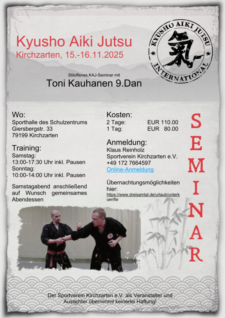 stiloffenes KAJ Seminar mit Großmeister Toni Kauhanen 9. Dan. Offen für alle Interessierten (mit und ohne Kampfsporterfahrung). Mehr Informationen folgen in Kürze. Zur Anmeldung.